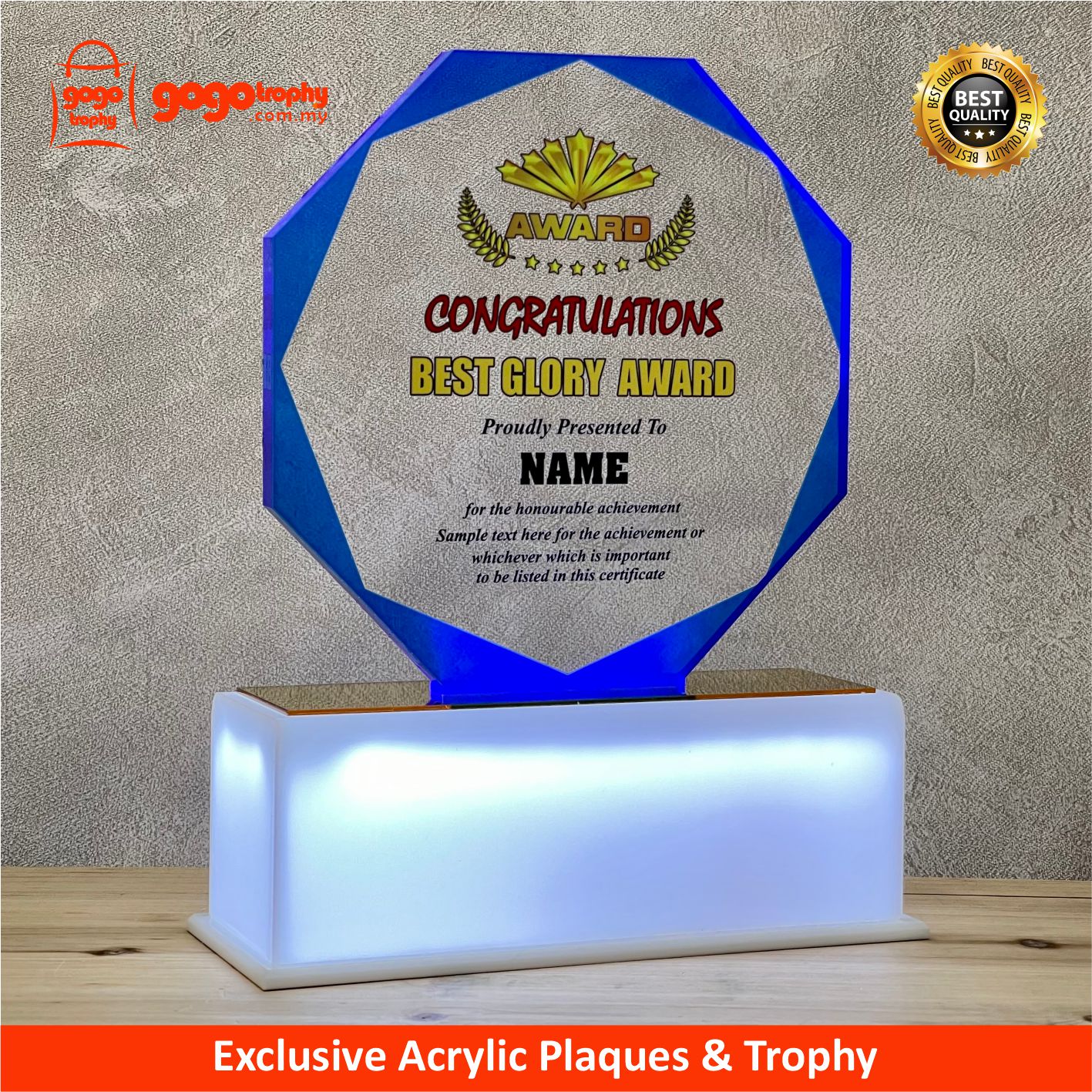 5141 LED Lighting Acrylic Plaque are the new mixtures highly-performance hybrid technologies with combination of UV-LED EMBOSS PRINTING will feature it's own special touch feeling and unique colours finished product . The noble qualities of the products will bring englightenment and will be loved by the consumers . FREE UV EMBOSS PRINTING !