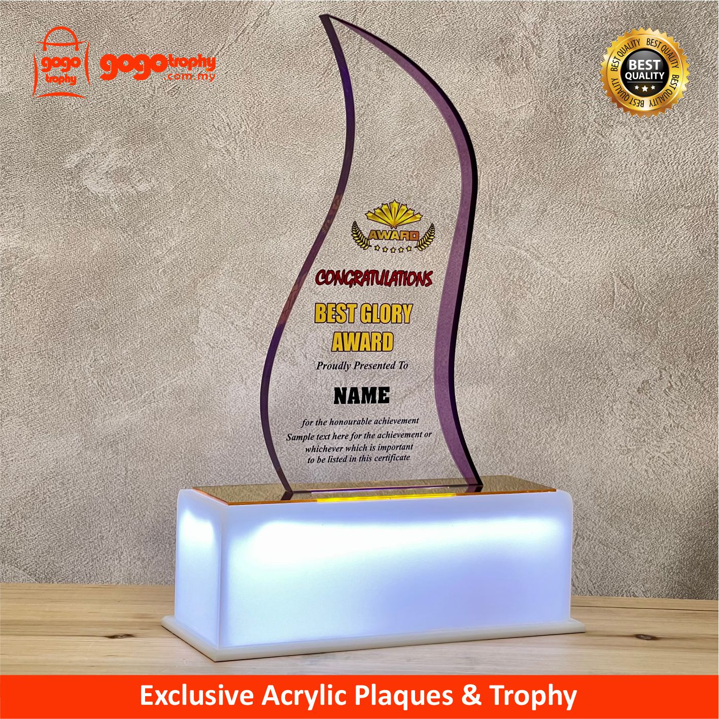 5142 LED Lighting Acrylic Plaque are the new mixtures highly-performance hybrid technologies with combination of UV-LED EMBOSS PRINTING will feature it's own special touch feeling and unique colours finished product . The noble qualities of the products will bring englightenment and will be loved by the consumers . FREE UV EMBOSS PRINTING !