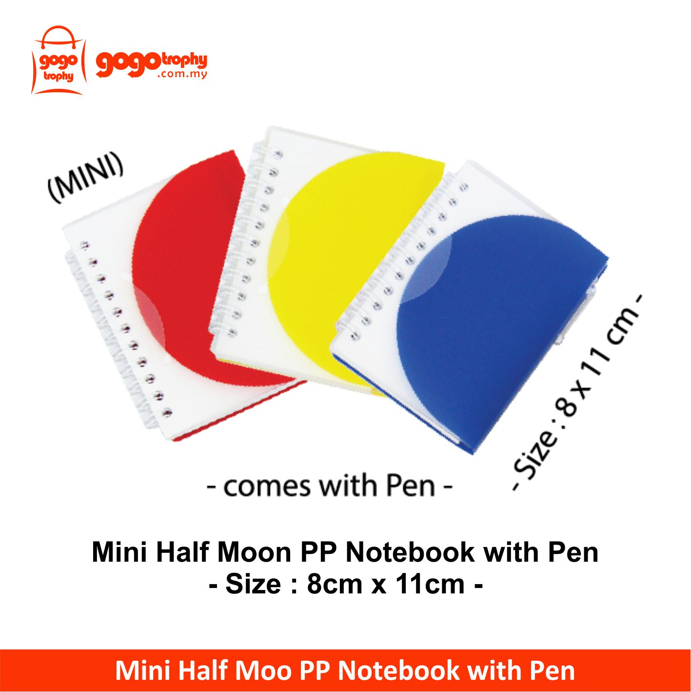Mini Half Moon PP Notebook with Pen pricing is per pcs without printing charges,if needed any additional for printing pls send us enquiry we will reply you as soon as possible . ASK FOR PRICE !
