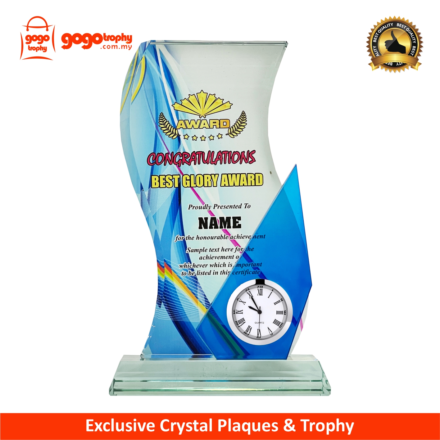 2072 Crystal Plaque c/w Clock Series with background artwork and the top quality clock to ensure you an accomplish crystal clock gift . FREE PRINTING !