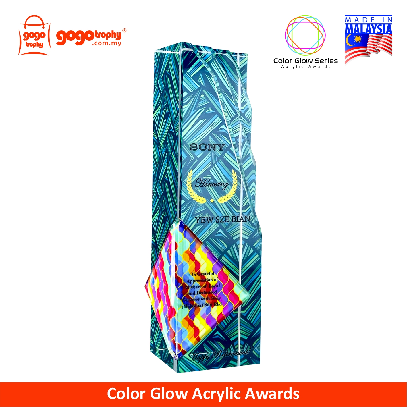 Elevate your recognition ceremony with our Color Glow Series Acrylic Awards - designed to impress with vibrant edges, a crystal-look high clarity appearance, and durable construction. Ideal for corporate recognition, employee awards, appreciation plaques, competition trophies, and graduation souvenirs. Personalize and custom with a logo and text. FREE artwork design & printing. NO minimum order quantity (MOQ).