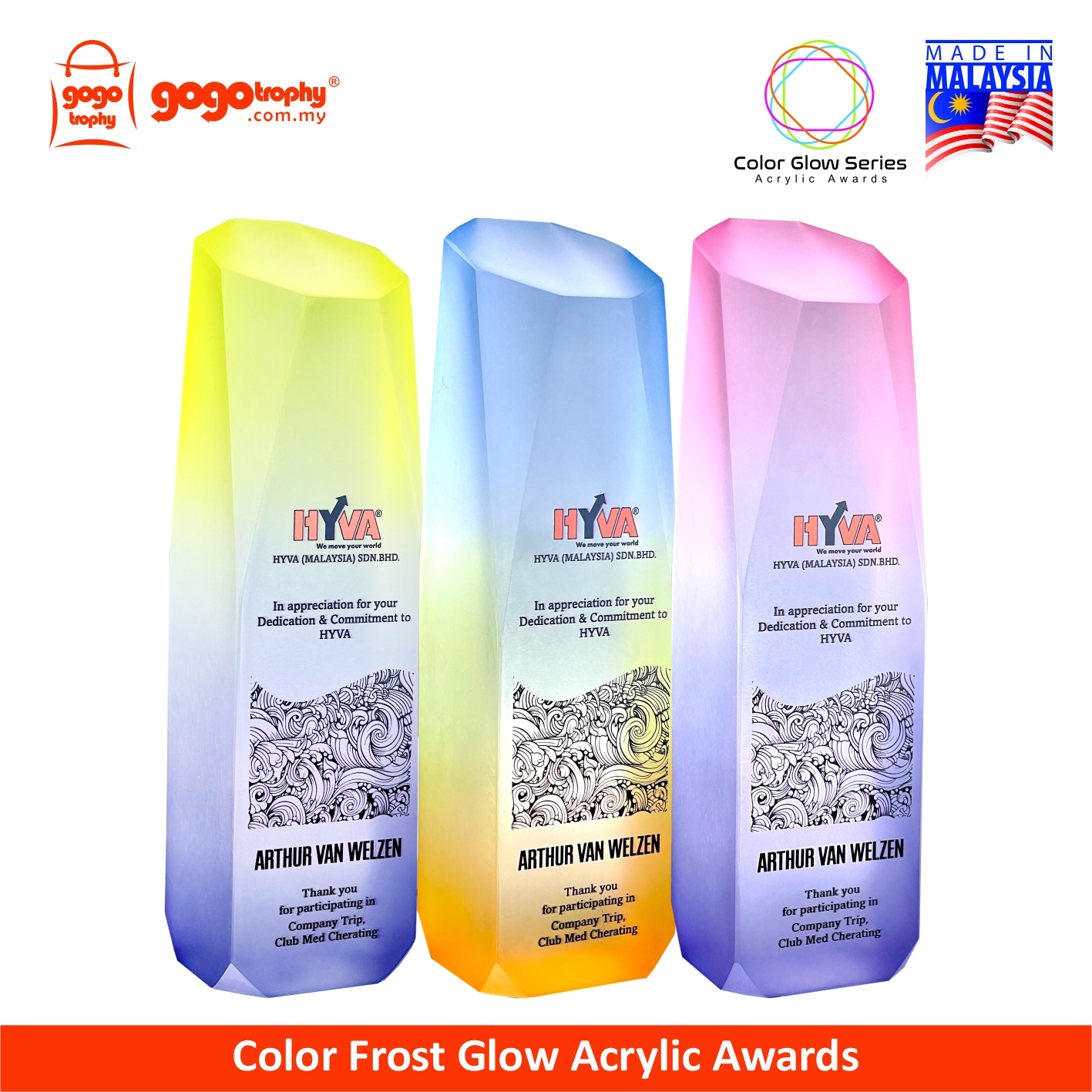 Elevate your recognition ceremony with our Color Glow Series Acrylic Awards - designed to impress with vibrant edges, a crystal-look high clarity appearance, and durable construction. Ideal for corporate recognition, employee awards, appreciation plaques, competition trophies, and graduation souvenirs. Personalize and custom with a logo and text. FREE artwork design & printing. NO minimum order quantity (MOQ).