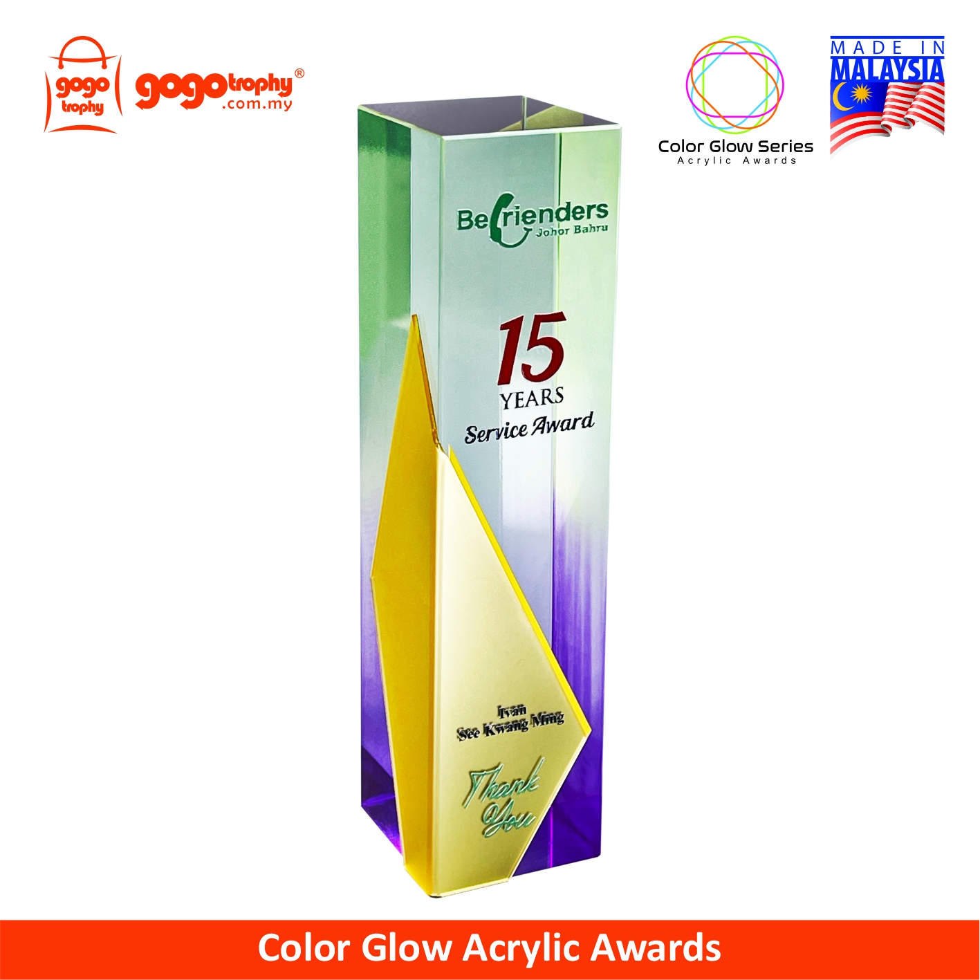 Elevate your recognition ceremony with our Color Glow Series Acrylic Awards - designed to impress with vibrant edges, a crystal-look high clarity appearance, and durable construction. Ideal for corporate recognition, employee awards, appreciation plaques, competition trophies, and graduation souvenirs. Personalize and custom with a logo and text. FREE artwork design & printing. NO minimum order quantity (MOQ).